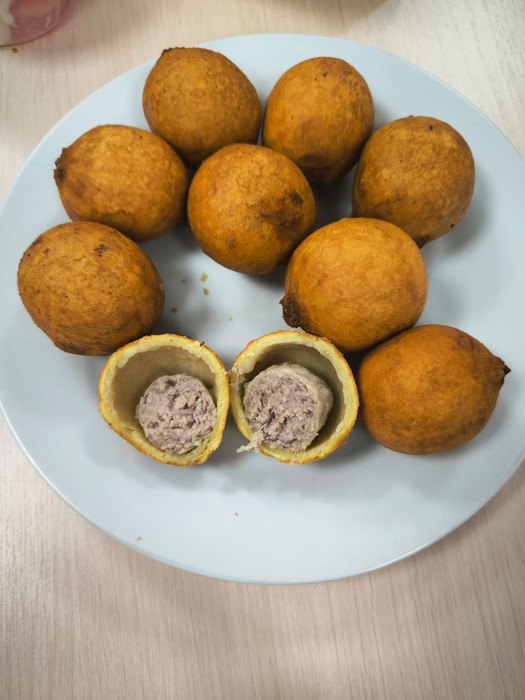 Состав теста: картофель, мука. Начинка: свинина, говядина, лук, соль, перец