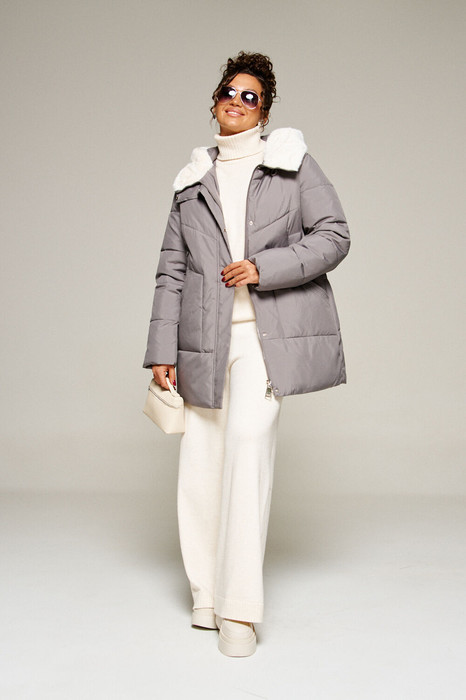 Капюшон с застежкой спереди умеренного объема. По периметру капюшона с внутренней стороны выполнена оторочка из искусственного меха, которая выполняет декоративную и защитную функции, создавая дополнительное тепло и защиту от ветра и холода.