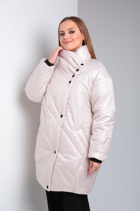 Куртка женская утепленная с ассиметричной застежкой на кнопки. Модель "О"образного силуэта. По переду выполнена стёжка, снизу вытачки. Карманы боковые "с листочкой". Спинка также со стёжкой и вытачками снизу. Рукав одношовный со спущенной линией плеча, снизу с вытачками. Воротник с мягкими складками по правой стороне. Утеплитель Hoopon 200, температурный режим до -15 градусов.