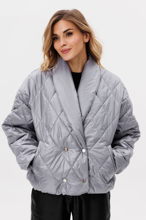 Куртка выполнена из плащевой ткани стеганой с утеплителем Isosoft. Куртка прямого силуэта, длиной до линии бедер. Спереди прорезные карманы и застежка на  пробивные кнопки. Спинка цельная. Горловина обработана воротником - шаль. Плечевой шов удлинен. Рукав рубашечного покроя, одношовный. Куртка на притачной по низу подкладке. По низу куртки эластичная тесьма с фиксатором.