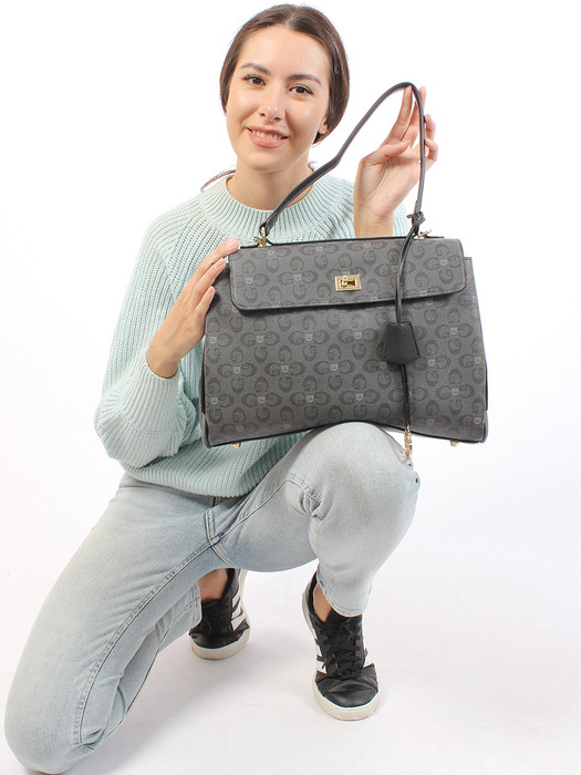 Сумка женская выполнена из экокожи канва. Детали: 1 короткая ручка 50см. Внутри изделия: 2 отделения на поворотном замке, 1 карман на молнии, 1 карман открытый. Снаружи изделия: 1 карман сзади изделия. Брендированная подкладка из хлопка. Металлическая брендированная фурнитура золотистого цвета. В комплекте фирменный пыльник.