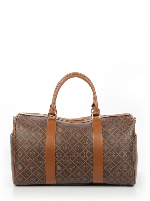 Сумка дорожная выполнена из экокожи «канва». Детали: 2 ручки по 40 см, 1 длинный регулируемый ремень на карабинах. Внутри изделия: 1 отделение на молнии, 1 карман на молнии, 1 карман открытый. Снаружи изделия: 1 карман на молнии с оборотной стороны изделия, 2 кармана на магнитных кнопках по бокам изделия. Брендированная подкладка из хлопка. Металлическая брендированная фурнитура золотистого цвета.