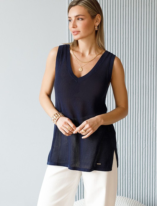Состав: 60%Хлопок 40%ВисЛетний топ полупрозрачной вязки выполнен из хлопковой пряжи. Идеально подойдет в жару, с мини-топом или в сочетании с купальником. Также отлично впишется в многослойные образы с джинсами и жакетом. Модель дополнена металлическим логотипом бренда.