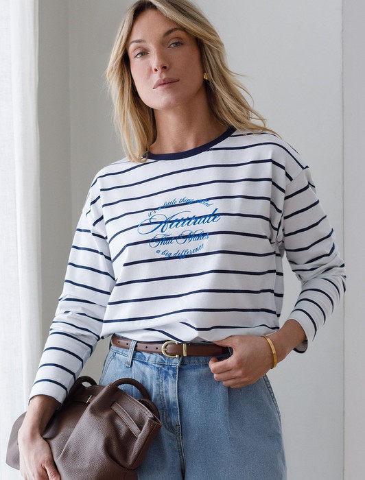 Состав: 92%Хлопок 8%ПУ Плотность: 170 Г/м2Свободный лонгслив белого цвета в темно-синюю полоску с длинным рукавом выполнен из премиального хлопка с добавлением эластана, плотностью 170 Г/м2, что обеспечивает комфорт и приятные тактильные ощущения. Полоска - придает изделию легкую текстурность, принт в виде надписи, который нанесен красками с устойчивым покрытием, добавляет стиля и индивидуальности. Перевод надписи: It is a litlle thing called attitude that makes a big difference - Это такая мелочь, как отношение, которое имеет большое значение. Круглый ворот создает универсальный образ, который подойдет для повседневного использования. Такой лонгслив идеально подходит для весеннего и летнего сезона благодаря легкой и дышащей ткани. Представленная широкая размерная линейка позволяет выбрать оптимальный вариант на любую фигуру, в том числе на плюс-сайз, обеспечивая свободу движений и удобство на каждый день. Этот комфортный лонгслив станет отличной базой в гардеробе, сочетаясь с различными стилями одежды и создавая простой, но эффектный образ.