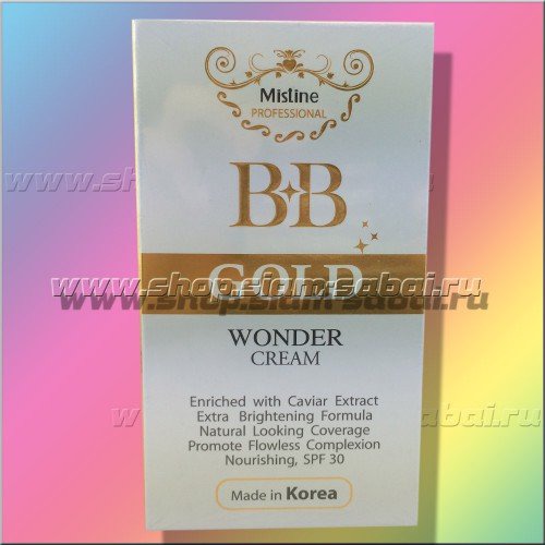 Крем BB Gold BB Mistine Gold Wonder cream Крем из знаменитой корейской серии «Уникальные ББ кремы – чтобы кожа была идеальной!» ББ Золотой крем  уникален тем, что это не просто обычный тональный крем, это антивозрастной, питательный и ухаживающий за кожей лица крем, при этом обладающий маскирующими свойствами тонального крема. То есть крем BB Mistine Голд - это одновременно и уходовая, и декоративная косметика. Крем BB Gold является одним из самых популярных и востребованных косметических средств в Таиланде, который наносится как основа под макияж и отлично маскирует все недостатки кожи. Крем BB Gold  имеет обогащенную формулу и  содержит натуральные масла лаванды, розмаринаи календулы, экстракт икры и витаминный комплекс. BB крем отлично скроет ВСЕ недостатки  на коже - пигментные пятна, покраснения, темные круги под глазами, неровности на коже, веснушки, прыщики, расширенные поры, и при этом совершенно не сушит кожу, не забивает поры, давая возможность коже «дышать» Крем BB  создает плотное покрытие и идеально выравнивает тон кожи, делает ее гладкой и матовой. Как и все ВВ кремы, крем BB Mistine Wonder Cream обладает антивозрастным действием.  ББ - крем также защищает кожу в течение дня от вредного воздействия окружающей среды, и имеет фактор защиты от солнца SPF 30. Применение: Рекомендуется использовать Крем BB  Gold Mistine каждое утро как основу под макияж Наносить BB Голд крем следует кончиком пальца, для всего лица вполне достаточно будет маленькой капельки крема ББ – крем имеет плотную текстуру и  легко распределяется по поверхности лица и шеи.  Ошеломительный результат  - гладкая, матовая бархатистая кожа, до которой приятно дотрагиваться. Объем 15 грамм, произведено в Южной Корее для продажи в Таиланде.