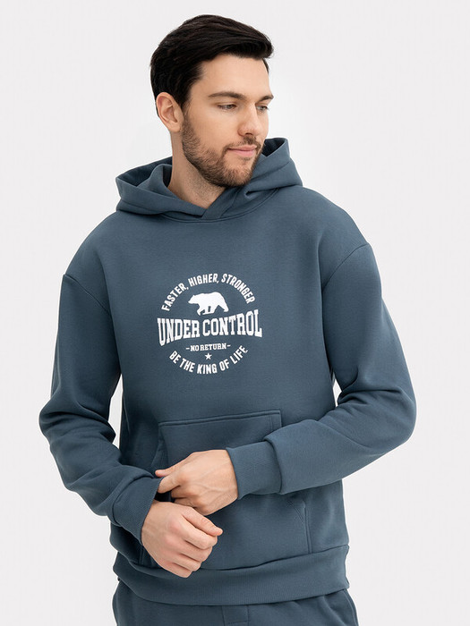 Мужское худи свободного силуэта из трикотажного футера с теплым подчесом. Круглая горловина с капюшоном, длинные рукава на манжетах, слегка спущенная линия плеча, пояс из рибаны – худи удачно сочетает комфортный дизайн и отличное качество!