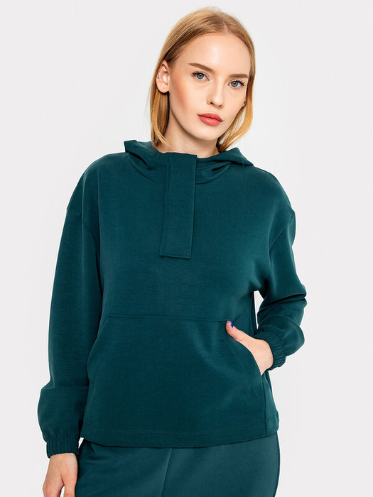 На детали переда настрочен накладной карман кенгуру.