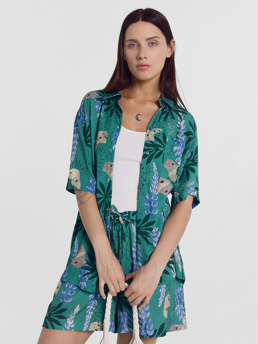 Горловина круглой формы с рубашечным воротником. Плечо спущено, пройма углублена. Рукав втачной, короткий. Низ рубашки прямой.