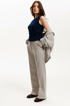 Брюки свободного силуэта, на средней посадке. Пояс отрезной с резиной 60RV. В боковых швах отстроченные карманы с подкладкой из кулирного полотна. По центру декоративный гульфик. Низ вподгибку.