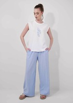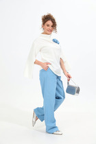 Брюки женские прямого силуэта из ткани. На деталях переда карманы с отрезным бочком. Пояс отрезной состоит из двух частей, задняя часть пояса присборена на резинку. Посадка средняя.