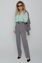 односторонняя складка. На задней детали вытачки. На брюках заутюжены стрелки. Низ брюк подогнут потайным швом. Брюки полной длины.