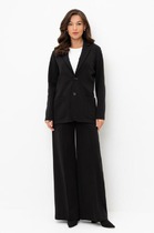 Черные женские брюки прямого свободного кроя сочетают в себе повседневный комфорт и изысканную деталь. Модель со средней посадкой дополнена изящным декоративным элементом по верхнему срезу — тонкой текстильной вставкой, стилизованной под край нижнего белья. Эта деликатная деталь придает образу игривую нотку и особый шарм, оставаясь при этом тактично скрытой под одеждой.