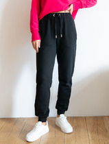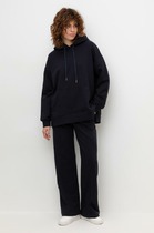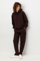 Брюки изготовлены из трикотажного полотна футер. Брюки прямые с высокой посадкой. Пояс отрезной из рибаны с эластичной тесьмой внутри. В передней части пояса с лицевой стороны пробиты петли и втянут шнур. Шов втачивания пояса распошит. Спереди обработаны карманы хулиганы. По низу брюк отрезные манжеты из рибаны.