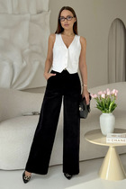 Брюки с посадкой на талии свободного силуэта. Пояс цельнокроеный с резиной внутри 20RV. По центру пояса пробиты петли, протянута бейка из основного полотна. На передних деталях карманы «хулиганы». Низ изделия застрочен швом в подгибку.