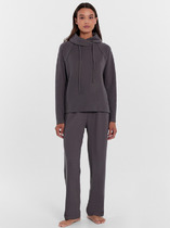 Брюки прямого силуэта, немного заужены к низу. Пояс цельнокроеный с резиной внутри 30RV. По центру пояса пробиты петли, протянута хб тесма 10мм. Низ брюк обработан в подгибку.