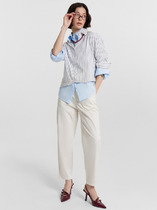 Брюки свободного силуэта с высокой     посадкой в пол. Пояс цельнокроенный с эластичной тесьмой внутри 50RV. По поясу сделаны 2 отделочные строчки.