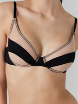 Бюстгальтер мягкий из эластичной сетки, без каркасов. Чашка с вытачкой. Низ обработан широкой бейкой из основного полотна с эластичной тесьмой внутри, с отделочной строчкой контрастными текстурированными нитками. Передний срез и проймы чашки обработаны с контрастной строчкой текстурированными нитями и жилкой по изнаночной стороне. Передняя часть бретели выворотная из основного полотна с жилкой внутри. Надставки бретелей по спинке из бретелечной тесьмы с регулировкой. Кольца-регуляторы. Застежка двойная.