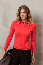 Женский джемпер облегающего силуэта, созданный из легкой и нежной вискозы с небольшим добавлением полиэстера.  Вырез круглой формы, с отложенным воротником-стойкой. Рукава длинные, прилегающие. Изюминка джемпера – удлиненные манжеты с прорезью для пальца. Идеально для прохладной погоды!