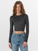 Материал с добавлением люрекса создает мягкое мерцание, которое привлекает внимание и переливается при движении. Круглая горловина аккуратно обработана бейкой, что обеспечивает аккуратный и прочный край.