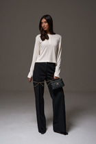 Джемпер свободный, укороченный. Горловина круглой формы с воротником стойкой. Рукава втачные длинные, плечо спущено. Нижние срезы джемпера и рукавов обработаны швом вподгибку.