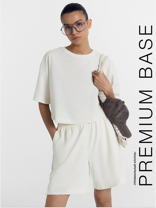 Укороченный джемпер свободного силуэта из трикотажного футера. Горловина круглой формы, рукава короткие. Спущенная линия плеча и углубленные проймы дарят свободу движений. Рекомендуем!