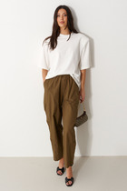 Футболка силуэта оверсайз из трикотажного полотна кулирка. Горловина круглой формы, обтачка горловины из рибаны. Шов горловины спинки закрыт бейкой из основного полотна.