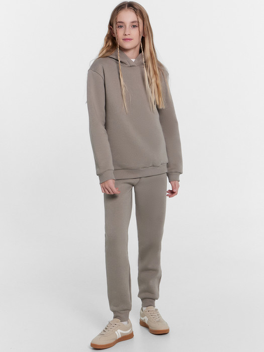 Комплект для самых модных девочек. Выполнен из трикотажного футера без подчеса. Анорак свободного силуэта с капюшоном, спущенной линией плеча, манжетами и поясом из рибаны. Брюки прямого силуэта, с резинкой и регулировочным шнурком в поясе, на манжетах. Уютный комплект!