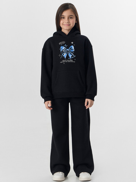 Худи для девочек, свободного силуэта (оверсайз), с капюшоном. Горловина округлой формы. Капюшон со средним швом, на подкладке из основного полотна. Шов втачивания капюшона закрыт хб тесьмой. Плечо спущено, рукав втачной длинный. По низу рукава отрезная манжета из рибаны. Пояс отрезной из рибаны, отстрочен. По переду карман кенгуру.                                                                                            Брюки для девочек, прямого силуэта. Пояс цельнокроеный с втачной эластичной тесьмой RV40. Пояс прострочен двумя отделочными строчками. По переду обработаны карманы в швах. Низ брюк обработан швом в подгибку на двухигольной плоскошовной машине.