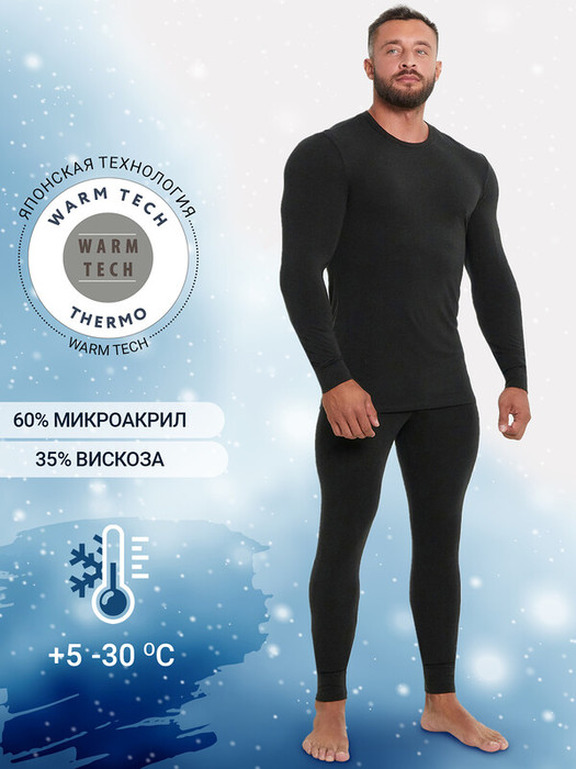 Мужской термо-компдект из полуприлегающего джемпера длиной до линии бедер и облегающих брюк. Рукава джемпера длинные, на манжетах, горловина круглая. Брюки без боковых швов, на манжетах, с эластичной тесьмой в поясе. Все швы плоские и комфортные. В состав полотна, созданного по японской технологии, входит микроакрил, который благодаря своей толщине (меньше волоса человека в 10 раз), создает своеобразные воздушные карманы между нитями – именно за счет этого свойства джемпер так хорошо согревает. Благодаря эффекту натуральной шерсти выдерживает температуры до -30 градусов Цельсия. Зиму контролируете вы!