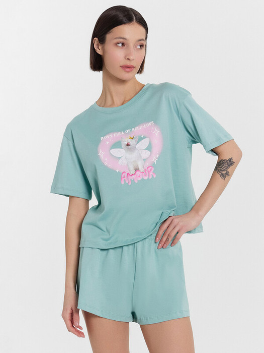 Женская пижама с принтом - отличный выбор для домашних образов. Футболка свободного силуэта с круглой горловиной и короткими рукавами со спущенной линией плеча добавляет легкости и расслабленности. Шорты свободного силуэта с эластичным поясом обеспечивают удобную посадку и свободу движений. Изделие выполнено из хлопковой кулирки - мягкого, дышащего материала, который позволяет коже оставаться сухой и комфортной в течение всего дня. Этот материал не вызывает раздражений и гипоаллергенен, что делает его идеальным для людей с чувствительной кожей. Кулирка также отличается долговечностью и прочностью, сохраняя свою форму и качество даже после многократных стирок. Эта пижама станет вашим любимым выбором для уютных вечеров и расслабленных выходных, предлагая комфорт и стиль в каждом элементе.