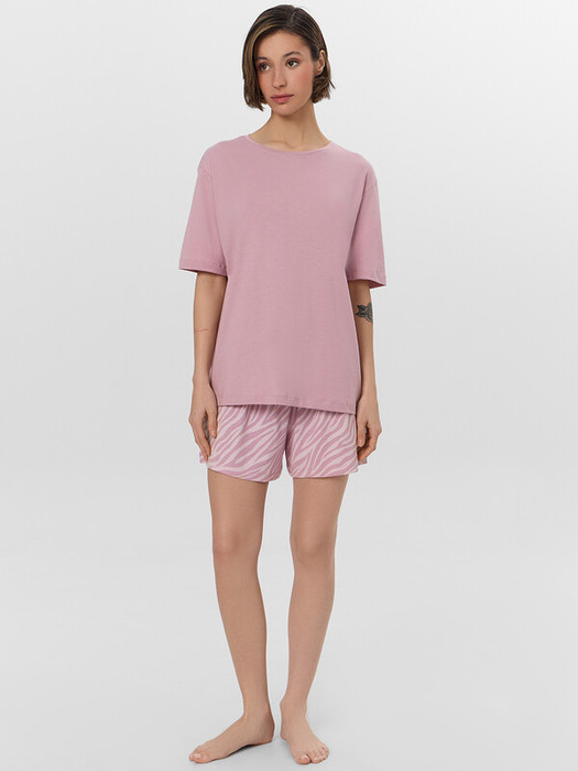 Домашняя пижама — это нежность, воплощенная в каждой детали. Набор из футболки и шорт создан для моментов, когда хочется раствориться в мягкости и комфорте. Футболка свободного кроя с овальной горловиной обволакивает тело легкостью, а короткие рукава оставляют ощущение свободы.
