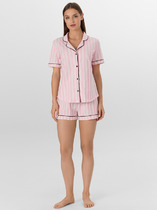 Рубашка с отложным воротником и короткими рукавами создает элегантный расслабленный образ. Центральная застежка на пуговицах и аккуратная обработка всех швов подчеркивают качество исполнения. Брюки с эластичным поясом на кулиске мягко сидят на талии, не стесняя движений.