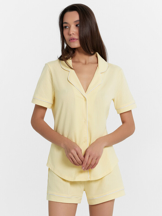 Женская пижама свободного силуэта создаст комфорт и стиль в вашем домашнем гардеробе. Рубашка прямого кроя с отложным воротником и лацканами, застегивающаяся на пуговицы, дополнена короткими рукавами для легкости и удобства. Свободные шорты длины мини с эластичным поясом и атласной тесьмой, которая завязывается на бантик, добавляют очарования и обеспечивают комфортную посадку. Контрастные канты на рукавах, воротнике и передней части рубашки подчеркивают уникальный стиль и добавляют изысканности. Эта пижама идеально подходит для сна, отдыха и домашних дел, предлагая вам комфорт и стиль в каждой детали. Рекомендуем для создания уютных и элегантных образов для дома!