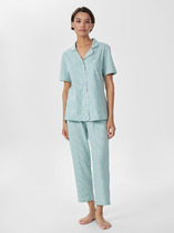 Рубашка с отложным воротником и короткими рукавами застегивается на аккуратные пуговицы. Свободные шорты с эластичным поясом бережно облегают талию, не стесняя движений во время отдыха или домашних дел.