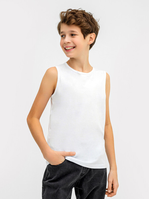 Майка полуприлегающего силуэта из хлопковой трикотажной кулирки. Длина до середины бедер.  Горловина круглая, окантована мягкой бейкой. Нижний срез обработан плоским швом. Комфортная классика для вашего мальчика!
