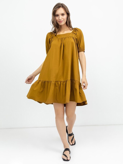 Платье А-силуэта из ткани поплин. Вырез горловины каре. Рукав короткий, окат и низ рукава присборены на резинку. Низ платья рисширяется к низу. Платье с поясом из основного полотна. По низу платья присбореная отрезная рюша. Длина платья выше колена."