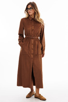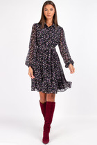 Платье полуприлегающего силуэта из ткани рошель. Горловина V-образной формы. Платье отрезное по талии, с эластичной тесьмой внутри. По эластичной тесьме проложены отделочные строчки. По детали переда средний шов. Детали спинки со средним швом. Рукав втачной, длинный. По окату слегка присборен. Длина рукава 3\4, по низу рукава настрочена эластичная тесьма которая делает сборку. Низ платья расширяется к низу. Длина платья ниже колена.