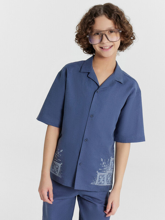 Сорочка верхняя для мальчиков прямого силуэта с воротником. По переду обработана застежка на пуговицы d=10mm и петли. Рукава короткие, втачные, слегка спущены. Нижние срезы изделия и рукавов обработаны швом в подгибку.