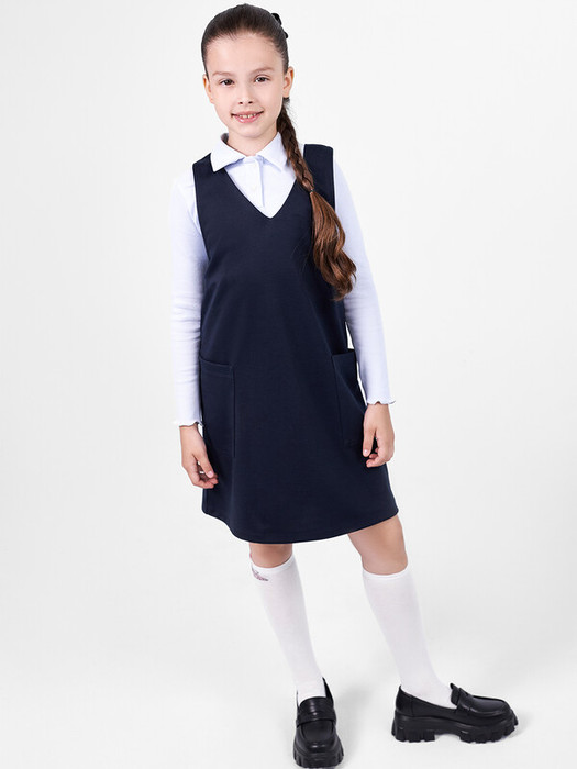 Сарафан для девочек прямого силуэта. Треугольный вырез горловины, длина выше колена. Проймы обработаны в "чистый край". По боковым швам сарафана накладные карманы. Без подкладки. Без застежки. Низ обработан швом в подгибку.
