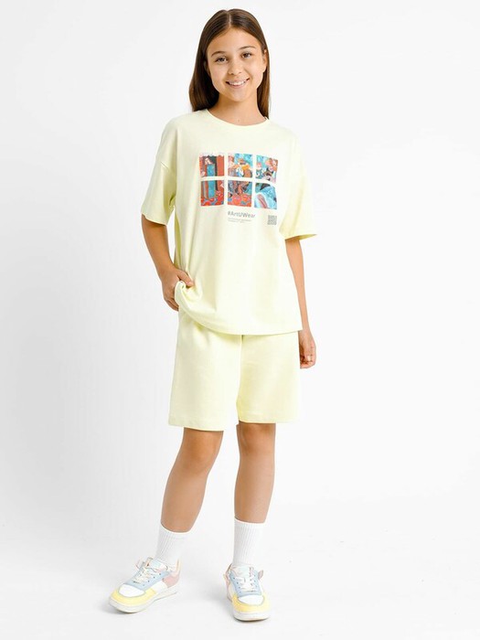 Шорты свободного силуэта для девочек. Выполнены из футера – мягкого, гигроскопичного и неприхотливого трикотажного полотна. Футер тонкий, без подчеса. Длина до колена. Боковые карманы добавляют практичности. Регулировать ширину по талии можно с помощью шнурка-завязки.