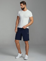 Шорты прямые, посадка средняя. Пояс цельнокроёный с эластичной тесьмой внутри. По переду пробиты петли и втянут шнур с застроченными концами. На левой детали переда имитация гульфика.  По переду карманы с отрезными бочками. Нижние срезы шорт обработаны швом вподгибку.