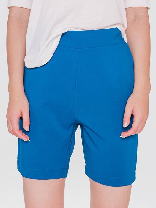 Шорты женские, выполнены из текстиля. Полуприлегающего силуэта, слегка заужены к низу. С высокой посадкой. Пояс широкий. По спинке в пояс вставлена эластичная тесьма. На детали переда карманы с отрезным бочком.