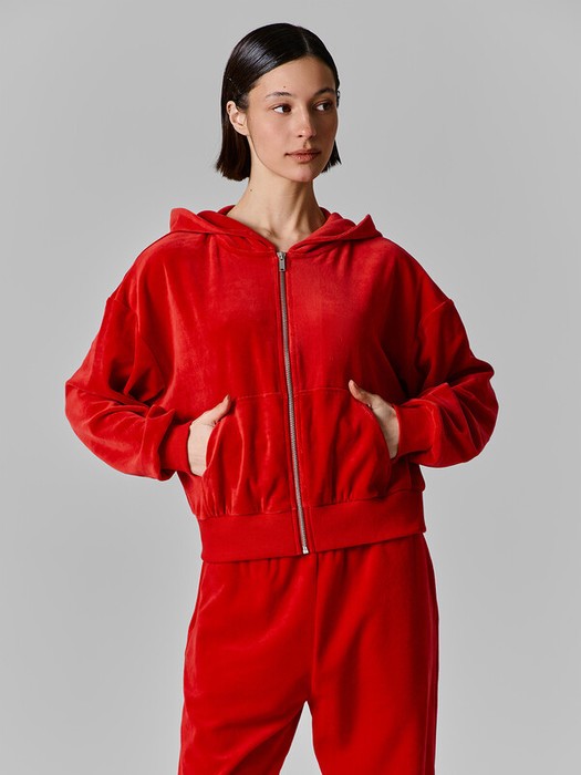Толстовка женская свободного силуэта. Перед и спинка цельнокроеные. Рукава длинные, втачные. По переду центральная застежка на металлическую молнию и накладные карманы. Горловина обработана капюшоном. По низу рукавов манжеты, пояс и манжеты из рибаны.