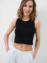 Топ облегающего силуэта, на узких бретелях. Горловина V-образной формы. Топ на подкладке из сетки, с чашками-вкладышами. Горловина и проймы окантованы бейкой из основного полотна. Бейки по проймам переходят в бретель, с регулировкой по длине (кольца и регуляторы). Топ с фигурным подрезом под грудью. В бретелях, окантовке горловин и пройм, по фигурному подрезу, эластичная тесьма. Нижний срез обработан швом вподгибку с эластичной тесьмой внутри