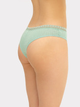 Трусы женские, средняя линия талии, силуэт - бразилиана, выполнены из трикотажного кулирного полотна. Передняя и задняя детали цельные. Подкладка ластовицы из основного полотна, отлетная по верхнему срезу.