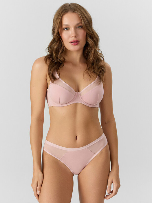 Трусы женские, средняя линия  талии, силуэт - липы. Передняя и задняя центральные детали выполнены из хлопка. Боковые детали из сетки (без боковых швов). Верхний срез трусов обработан жилкой. Нижние срезы трусов обработаны жилкой 6мм. Верхний срез подкладки ластовицы отлетной.