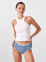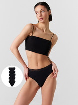 Передняя и задняя детали выполнены из микрофибры. Ластовица из кулирной глади отлетная по переднему срезу. По талии жилка тканая настрочена на п/ш с узким межигольным расстоянием.