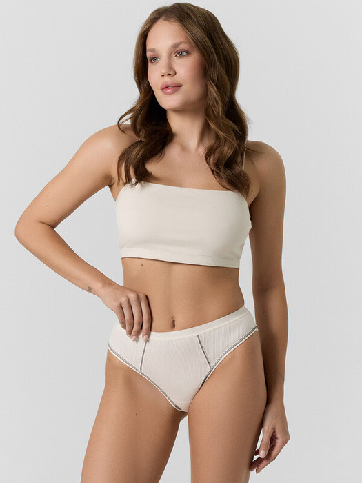 Трусы женские со средней линией талии силуэта «слип» из трикотажного полотна рибана. Передняя деталь  с  рельефами, по которым проложены  декоративные строчки. Ластовица из кулирной глади отлетная по переднему срезу.