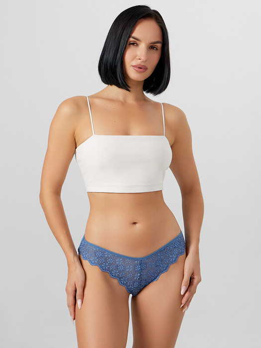 Передняя часть из ажурного кружева добавляет лёгкости и чувственности, а задняя деталь из гладкого хлопка со средним швом гарантирует комфорт и поддержку. Гигиеничная ластовица из натурального материала и аккуратная обработка краёв исключают натирание.