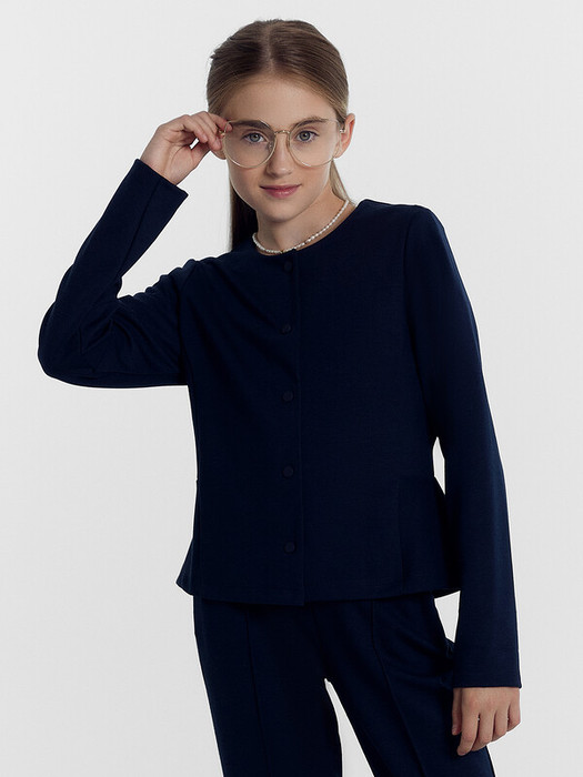 Жакет полуприлегающего силуэта с баской и застежкой на кнопки. Горловина круглой формы. Рукава длинные, втачные. Низ рукавов и изделия обработаны на 2-х игольной плоскошовной машине швом в подгибку.